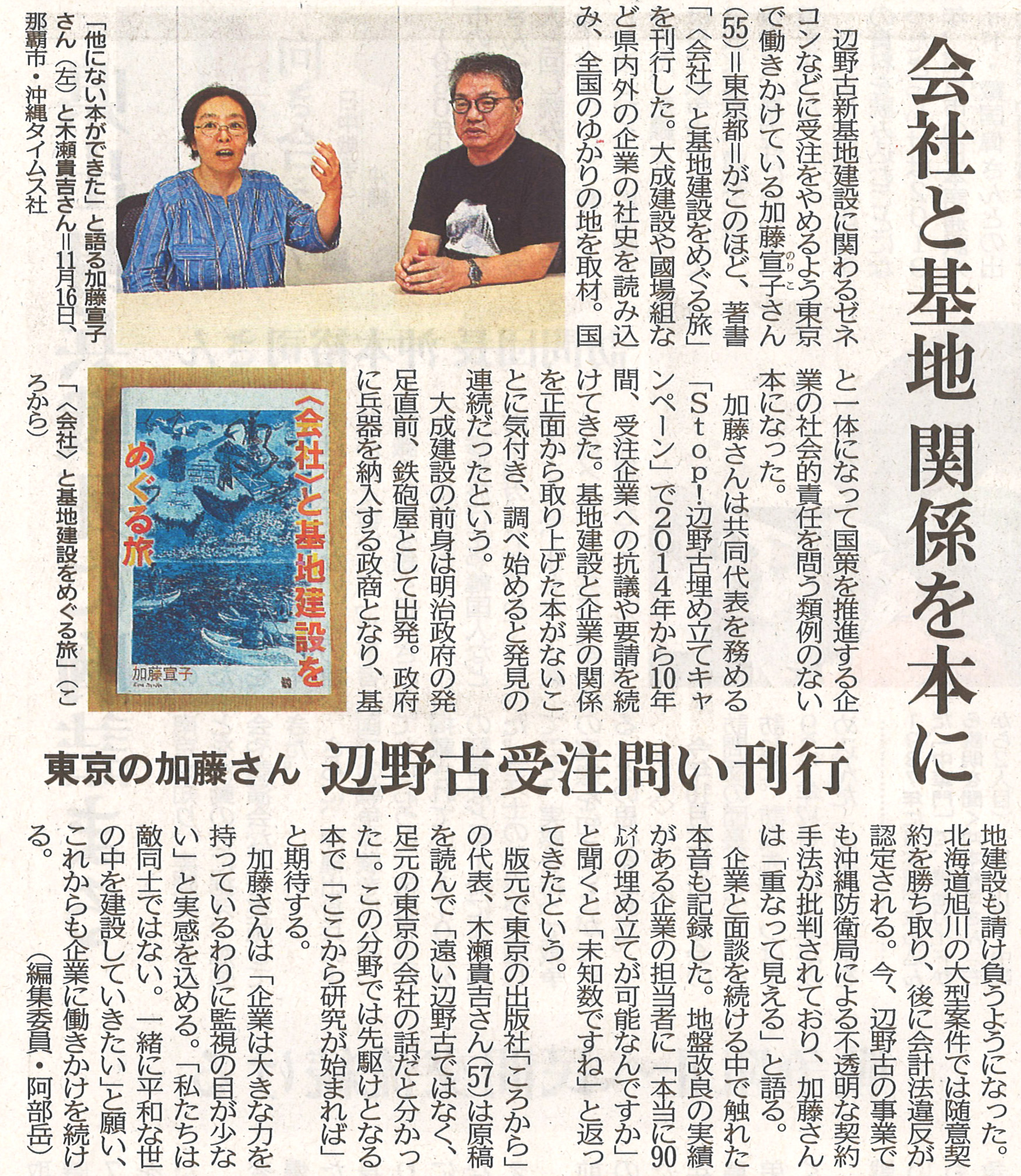 会社と基地 関係を本に 東京の加藤さん 辺野古受注問い刊行(沖縄タイムス)