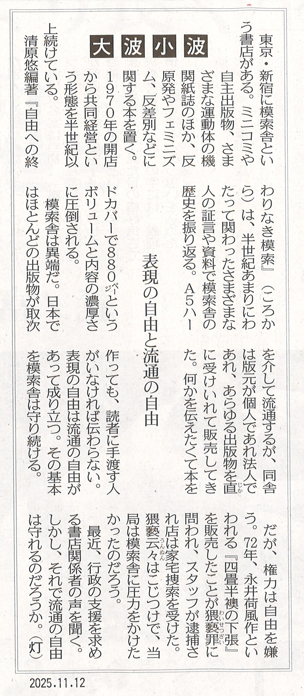 が東京新聞(2025年11月12日夕刊)のコラム「大波小波」で紹介されました。
