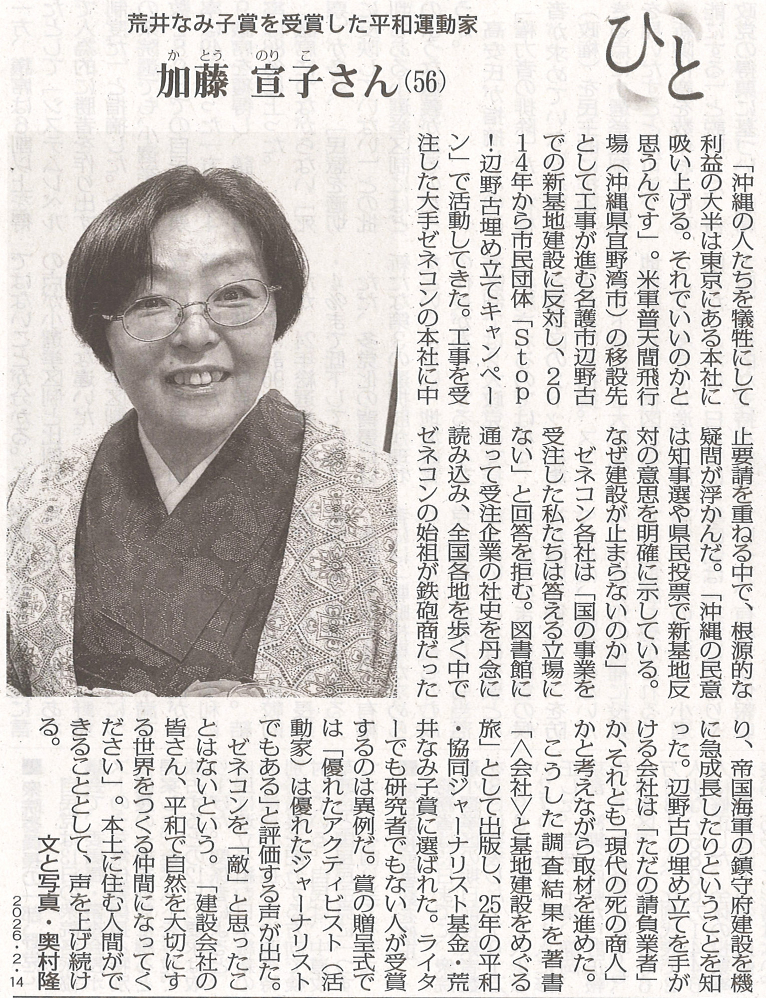 ひと 加藤宣子さん=荒井なみ子賞を受賞した平和運動家